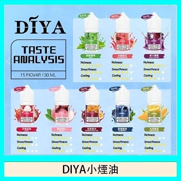 DIYA叮啞全新推出 15 種口味小煙油,0-50MG 尼古丁鹽濃度選擇,滿足不同需求。
