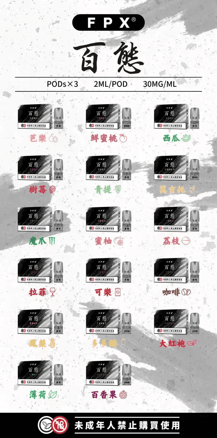芭樂 鮮蜜桃 西瓜 樹莓 青提(白葡萄) 魔爪 蜜柚 荔枝 拉菲紅酒 可樂 咖啡 鳳梨 大紅袍 薄荷 百香果